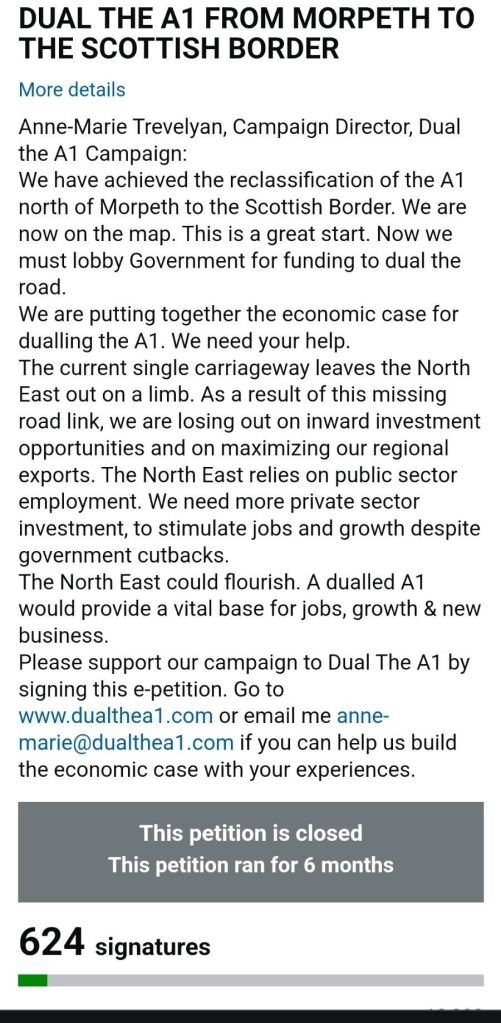 As of this evening, the Northumberland Coast Loop Petition stands at 628 signatures, which means it now has exceeded the figure achieved by the Dual the A1 from Morpeth to the Scottish Border Petition back in 2012, which only garnered 624 signatures.