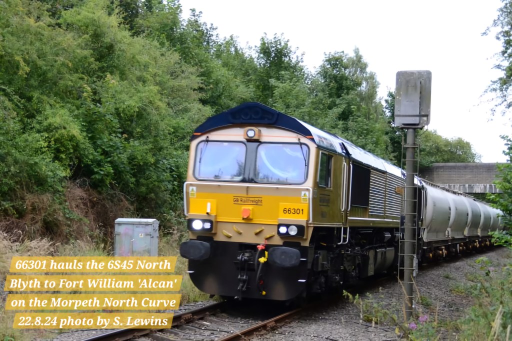 The picture below shows Class 66 (66301) hauling the regular North Blyth to Fort William ‘Alcan’ tanks (filled with Alumina at Port of Blyth and taken to the Alvance smelter near Fort William) along the Morpeth North Curve which links the Hepscott Line between Bedlington and Morpeth to the East Coast Main Line.