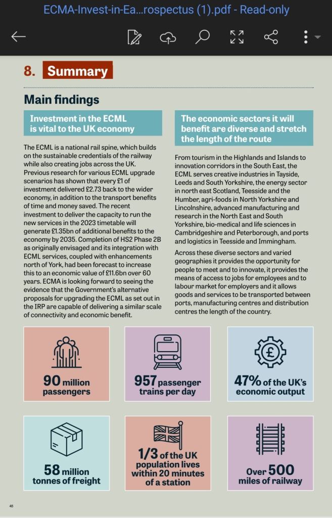 Based on strong evidence from the East Coast Mainline Authorities, expansion of the role of the ECML and connected lines is a much more assured path to economic growth, with figures from their document suggesting per £1 invested, it generates upto £2.73 in wider economic benefits (see image below).