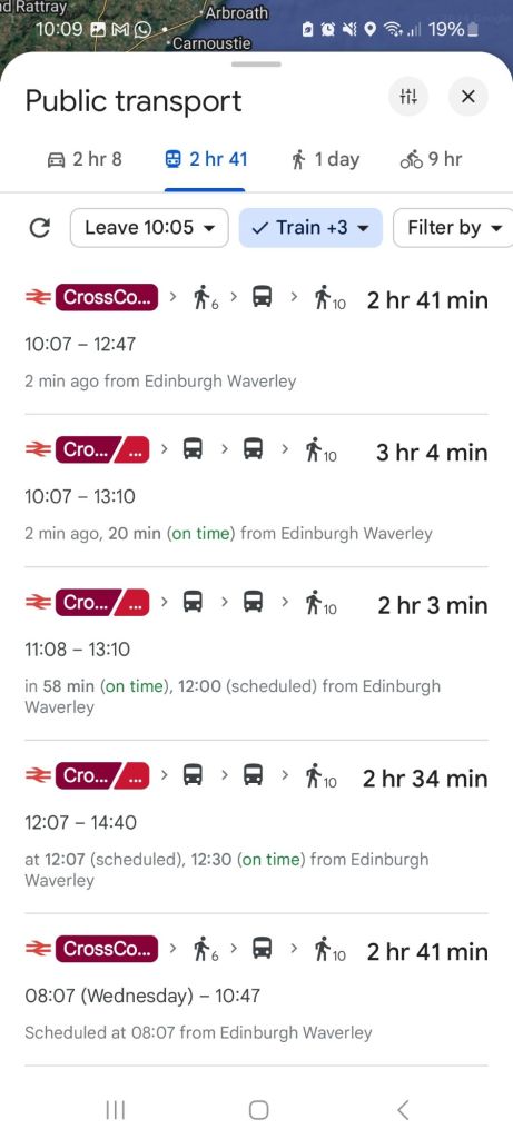 Using Google Maps, a trip from a city such as Edinburgh to Cragside, using public transport as it stands could take as little as 2hrs 3mins (compared to 2hrs 8mins to drive), using the East Coast Main Line to Alnmouth Station, although this is very much like a ‘swiss cheese model’ of everything aligning up well, with a lot of variation at other journey times.