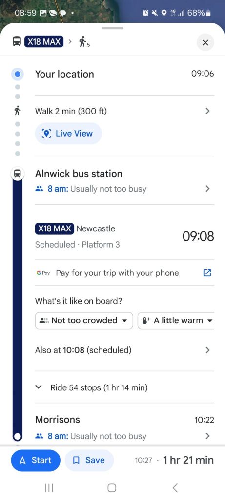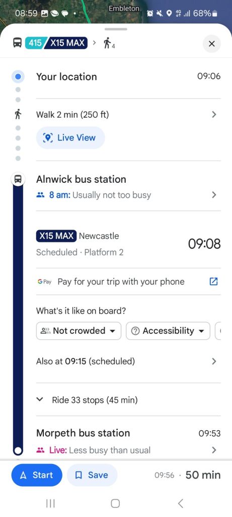 Naturally if you’re target destination is Morpeth, you’d catch the X15 for the shortest journey time, either having more time in that town itself, or being able to depart later/arrive home earlier, all else being equal; but the X15 serves fewer places (33 stops compared to 54 on the X18), while the X15 does connect smaller places such as Shilbottle, Felton and more, the slower X18 provides a through connection for the larger settlement of Amble, links to Alnmouth Station for Alnwick, Amble, and other settlements nearer the coast. It might be slower but is arguably the service that provides more connections for more people.