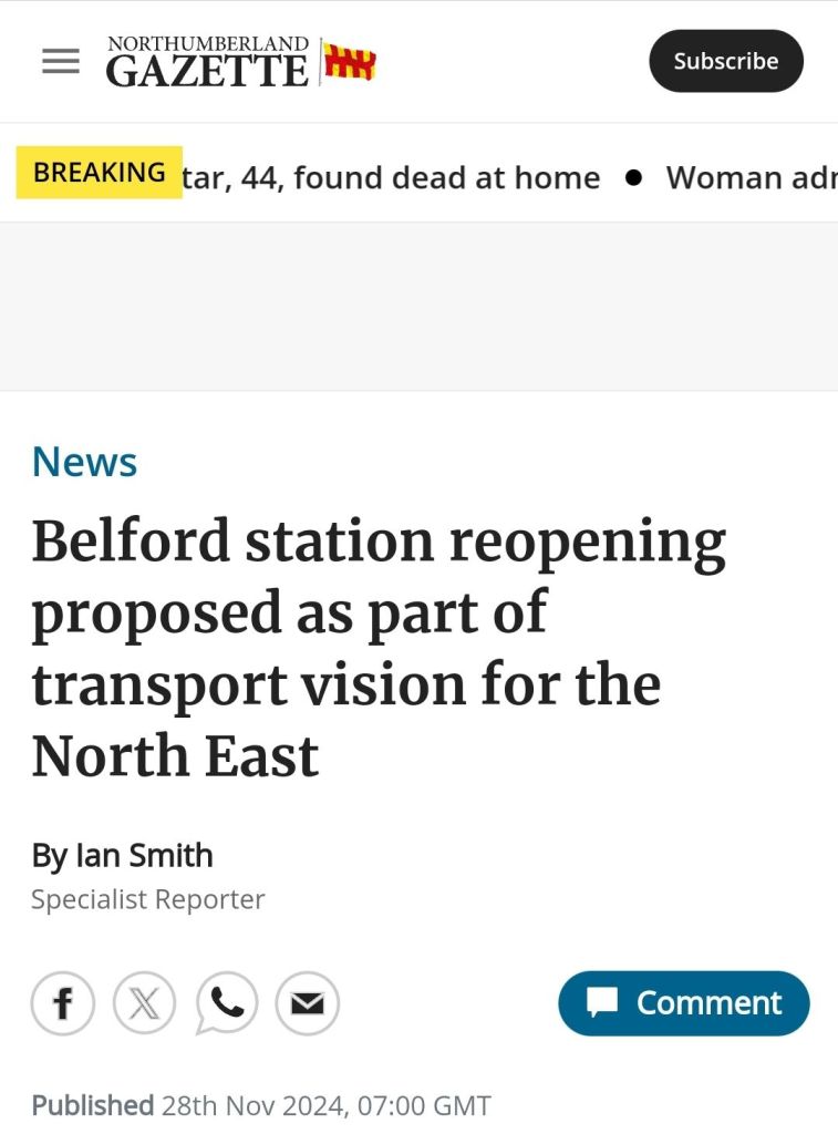 In the last few days, two articles cite plans for new stations at Killingworth in North Tyneside, and at Belford in North Northumberland on the East Coast Main Line (ECML).
