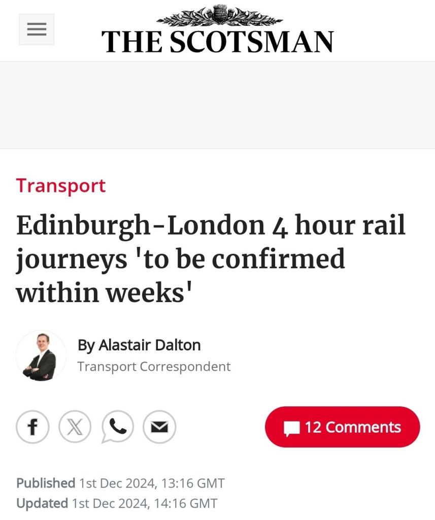 There has also been a recent announcement in The Scotsman about LNER getting a timetable change that would result in a regular service between the Scottish and English capitals of just four hours and 10 minutes, calling only at Newcastle and York.