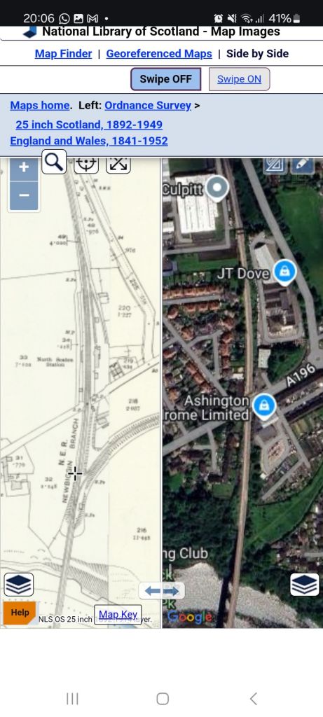 As stated above, the line to/from Newbiggin By The Sea was described by the OS 25 inch maps of 1892-1914 as the ‘Newbiggin Branch’, which diverged from the Newcastle, Backworth and Morpeth route at Bedlington. The two photos below show this from the excellent National Library of Scotland side by side map resource.