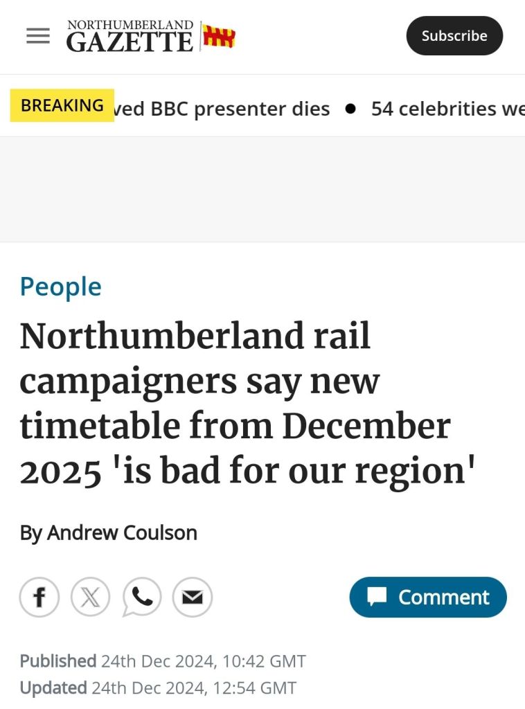 The above article from the Northumberland Gazette highlights the challenges faced in the December 2025 timetable change; which while offering some improvements on some services, has also resulted in the loss of others, notably some LNER services and specifically the 08:10 service between Alnmouth and Newcastle being lost, which is an important one for local commuters travelling into Newcastle.