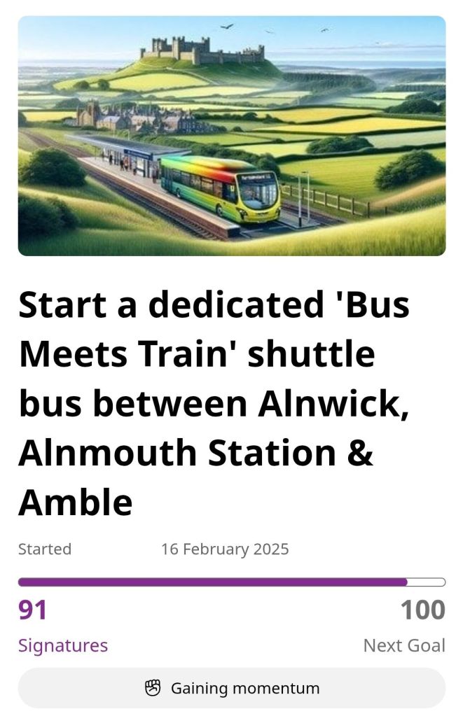 There have long been suggestions made for a dedicated bus connection between the town of Alnwick and Alnmouth railway station; and a post on the Alnwick Matters Facebook Group prompted me to launch a petition for such a service.
