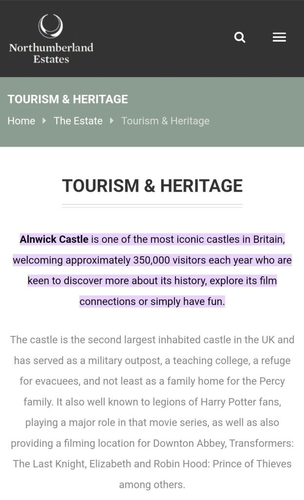 Starting with Alnmouth Station itself, it is one of the best used on this stretch of line, used by, in 2023/24 a total of 353,000 passengers (of which I’m one on a semi-regular basis); Alnwick could arguably claim to be the leaded Northumberland town for tourism, being home to Alnwick Castle (itself seeing approximately 350,000 visitors per year according to a Northumberland Estates webpage (see below), as well as The Alnwick Garden and Lilidorei, Barter Books, Bailiffgate Museum and many other smaller attractions within Alnwick, and nearby drawing in hundreds of thousands of tourists each year.