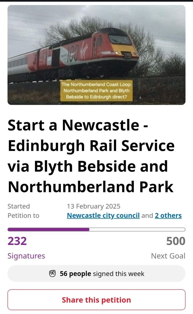 Just over a month since the launch of the new petition calling for a Newcastle to Edinburgh via Blyth Bebside and Northumberland Park rail service, it is performing strongly, with 232 signatures at the time of writing.