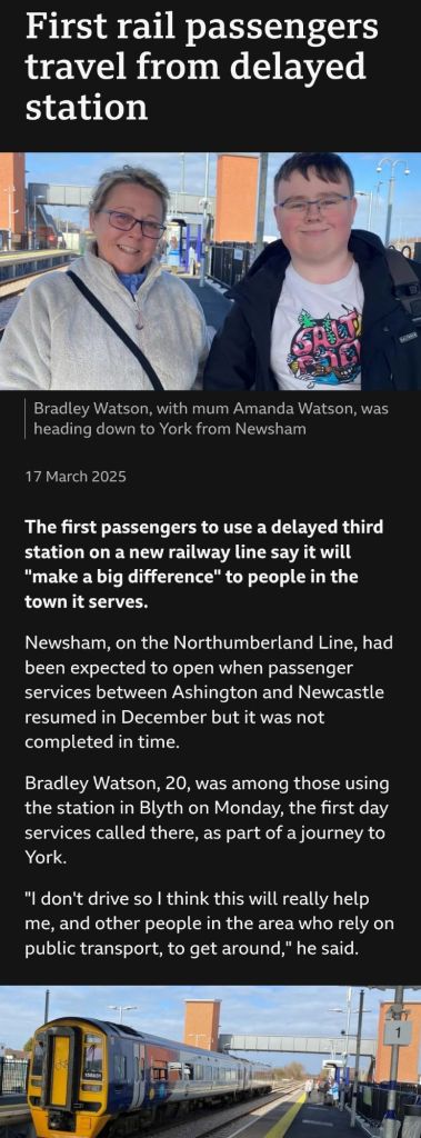 A recent BBC article also shows that journeys starting at these new stations on the Northumberland Line are not just local ones, to and from Newcastle. An extract below from this article states that Mr Watson (20) was using the newly opened station to travel to York.