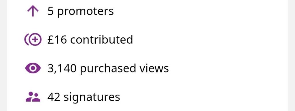 Thank you to everyone who has made a contribution of any size, even those simply sharing these petitions with friends and family is of huge benefit at zero cost, and please help keep up the momentum!