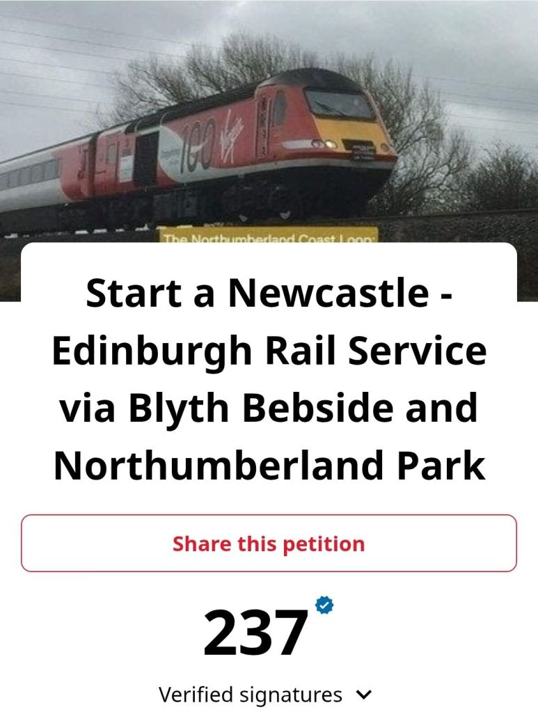As of 21.3.25, the petition for the Northumberland Coast Loop route to Edinburgh from Newcastle (Newcastle – Bedlington – Pegswood – Berwick – Edinburgh) is performing well with 237 verified signatures