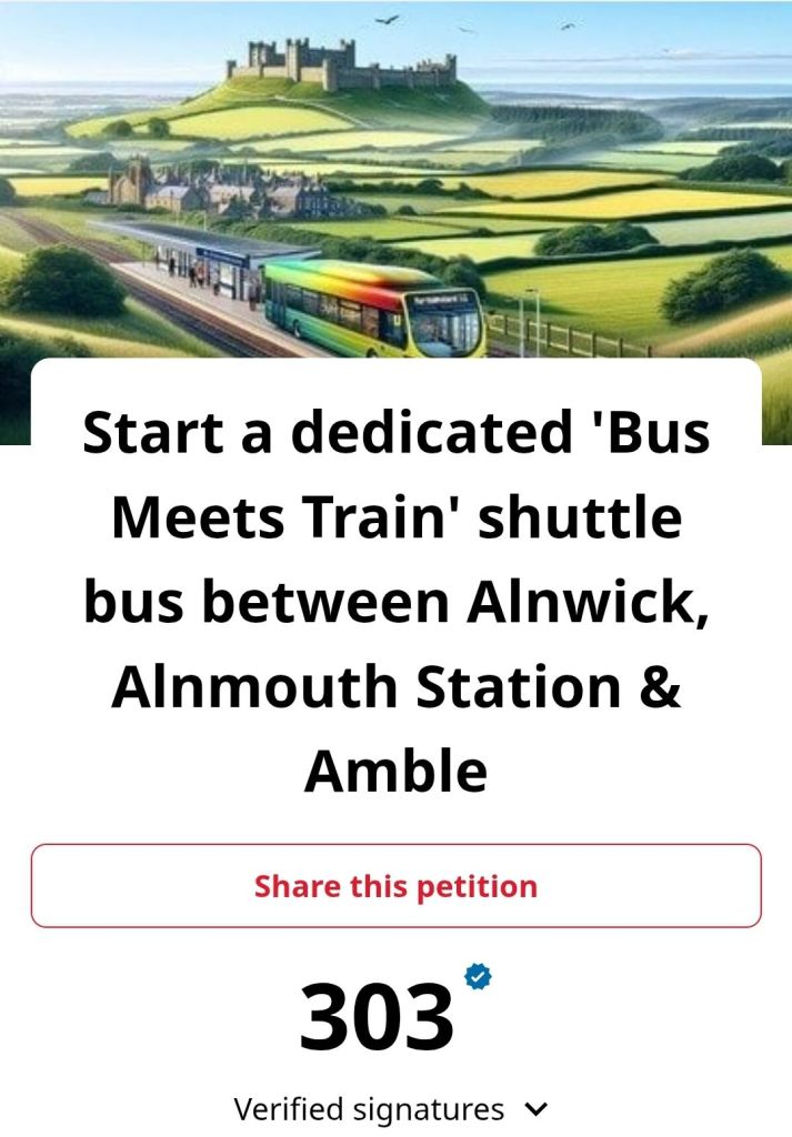 The petition is performing well, having just exceeded 300 signatures, and now also has a bespoke link to it here: https://www.change.org/AlnwickAlnmouthAmbleBusMeetsTrainCampaign