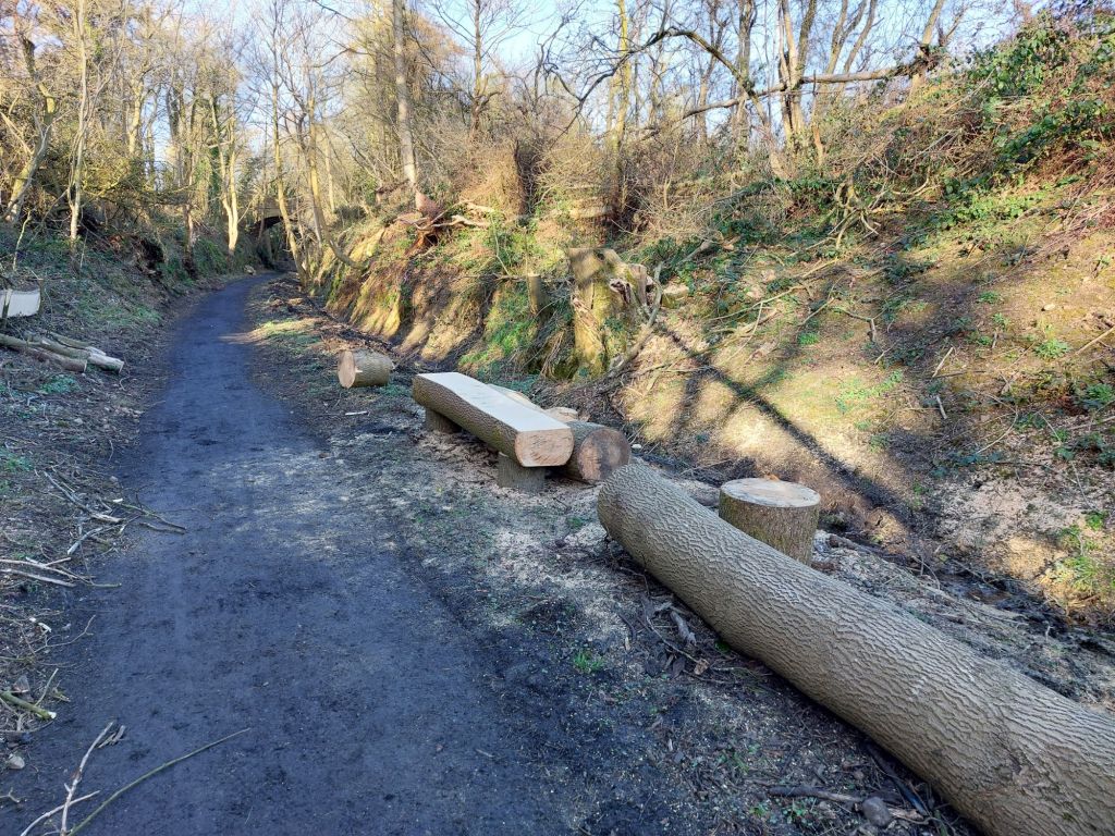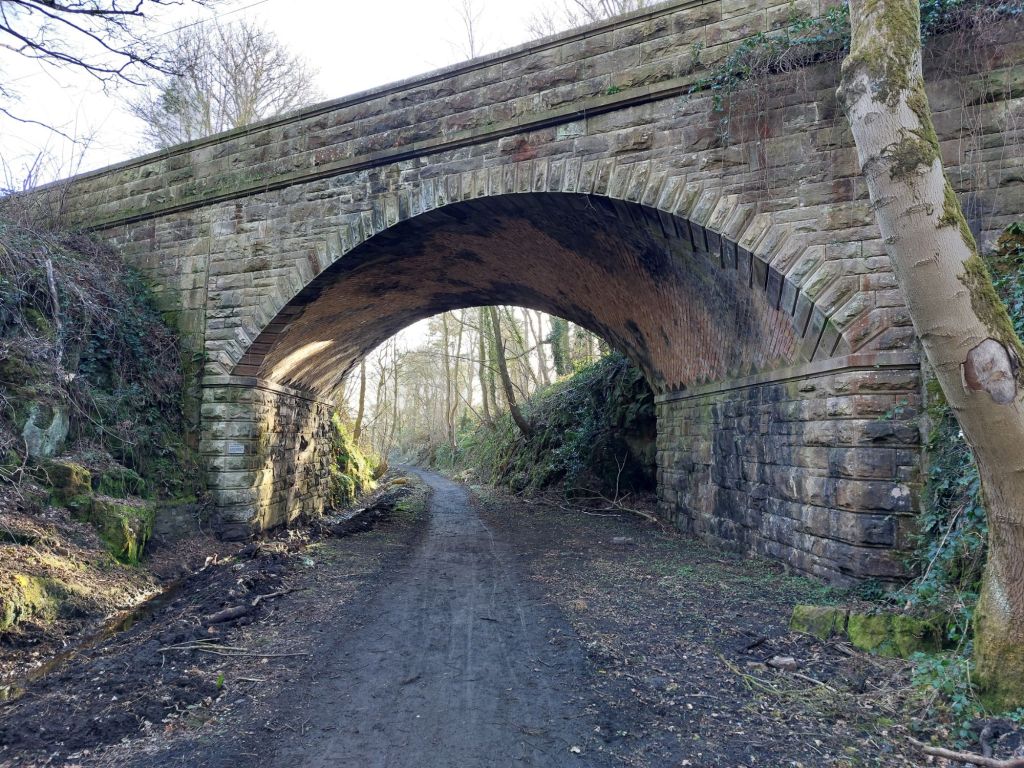 Approaching the Rugley Bridge through a deep, and quite damp cutting, we pass a large bench made from felled wood (this stretch was hard to pass due to swampy conditions and a number of trees fallen during Storm Arwen in November 2021, with windspeeds in the area reaching 98mph at nearby Brizlee Wood.