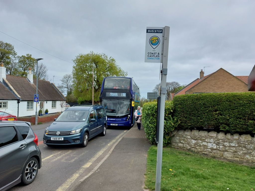 These bus stops already sit on a well used bus route, as can be seen by the presence of the Arriva operated X18 at the time of the photo, but as can be clearly seen, there is no ‘Coast and Castles Connection’ branding on this bus. This bus is instead liveried for the X21/X22 between Newbiggin by the Sea and Newcastle, and is therefore well ‘off the patch’ in Warkworth.