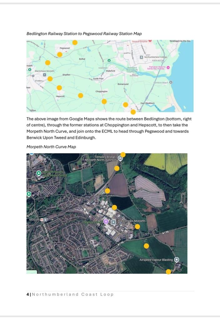 The upper map shows the overall route, leaving the Northumberland Line at Bedlington, the route heads in a west/north west direction towards and through the village of Hepscott, then curving towards the north east and rejoining the ECML.