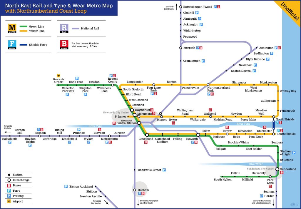 A very kindly shared route map from Paul (‘@lf_p’ on Twitter/X), this is a visualisation of a ‘Route Map’ across the North East, ranging from Berwick upon Tweed in the north, down to Horden, and Durham in the south, with Haltwhistle in the west.