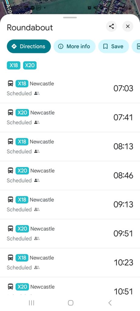Taken together, these two services give around two buses per hour near to the station, but the variation in timings means that buses are not running a consistent timetable, for example the X18 towards Newcastle at 07:03 is then followed by the 07:41 X20 (38mins later), then the next X18 at 08:13 (32 mins later).