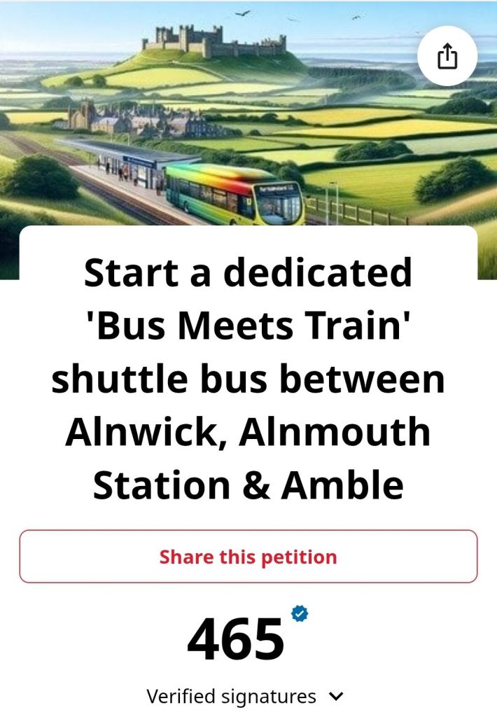 The next petition is a for a dedicated ‘bus meets train’ shuttle serving the non-rail connected towns of Alnwick and Amble, which is currently standing at 465 signatures.