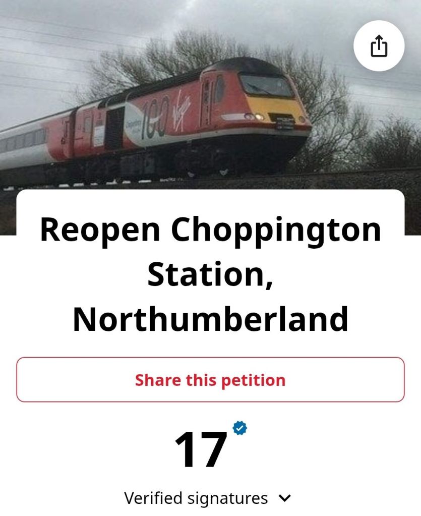 This petition to reopen Choppington station on the line between Bedlington, Morpeth, and Pegswood has only just launched in the last few days; but has already attracted 17 signatures of support.