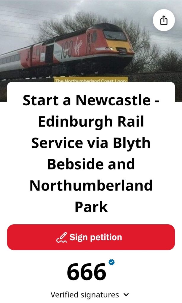 As can be seen above, the petition for the proposed Northumberland Coast Loop rail services between Newcastle Upon Tyne, along the Northumberland Line to Bedlington, then back onto the East Coast Main Line (ECML) near Pegwood, to then head to Edinburgh has now reached 666 signatures since 13th February 2025.
