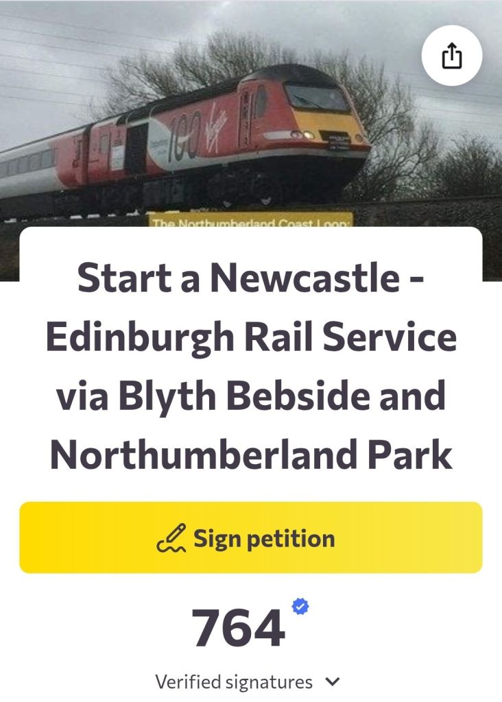 As of today (17.7.25), the Northumberland Coast Loop petition for a Newcastle – Edinburgh Rail Service via Blyth Bebside and Northumberland Park has now surged ahead to 764 signatures.