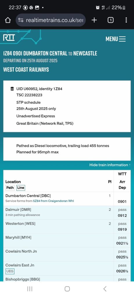 Link to 1Z84 Dunbarton to Newcastle, 25.8.25 on Realtime Trains
