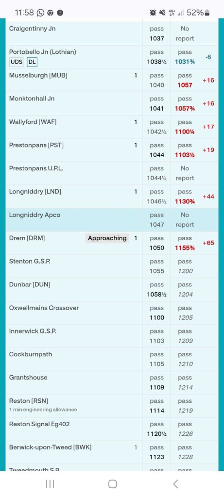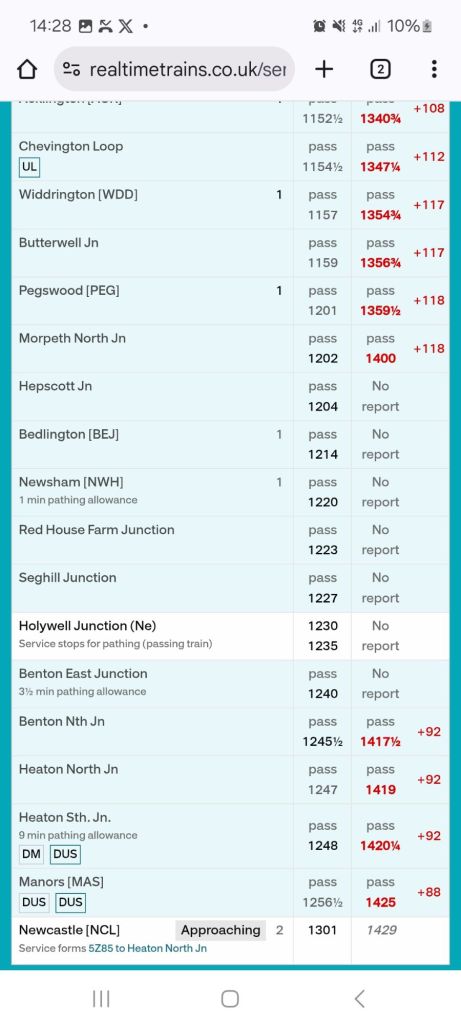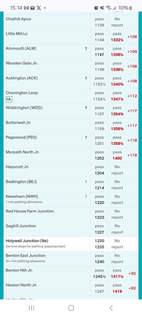 The change of route allowed the recovery of 26 minutes, with the delay falling from 118 minutes late to 92 minutes late, with expected timetable for the route via Bedlington from Morpeth North Junction (12:02) to Benton North Junction (12:45½) expected to take 43½ minutes overall, compared to the 17½ of the route via Morpeth and Cramlington for this train (running at max of 95mph with a c.450ton trailing load).