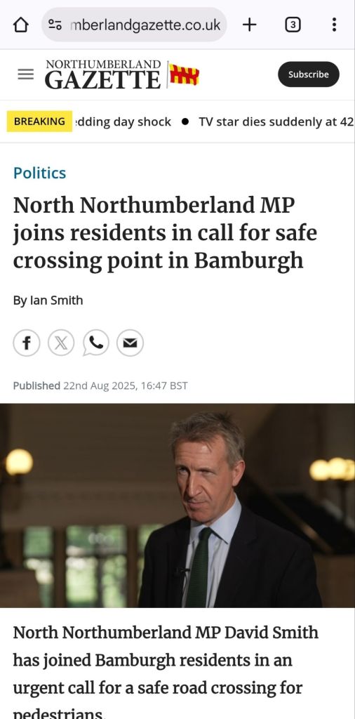 Dualling of the A1 would, however, bring the considerable downsides of increased volumes of traffic both on the A1 itself (overwhelming other stretches of the road), and in places like his own ward of Bamburgh, road traffic is already a significant safety issue, with the campaign for a safer road crossing in Bamburgh gaining increasing traction, and with venues such as Bamburgh Castle attracting around 150,000 visitors a year, it brings a lot of vehicles into the historic village, making the roads busy and increasingly risky for visitors trying to enjoy the village.