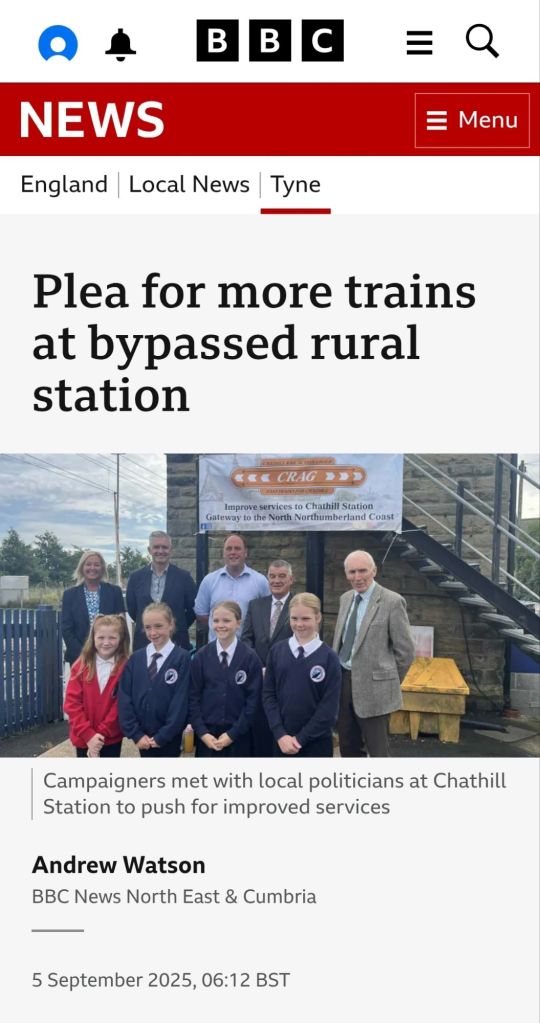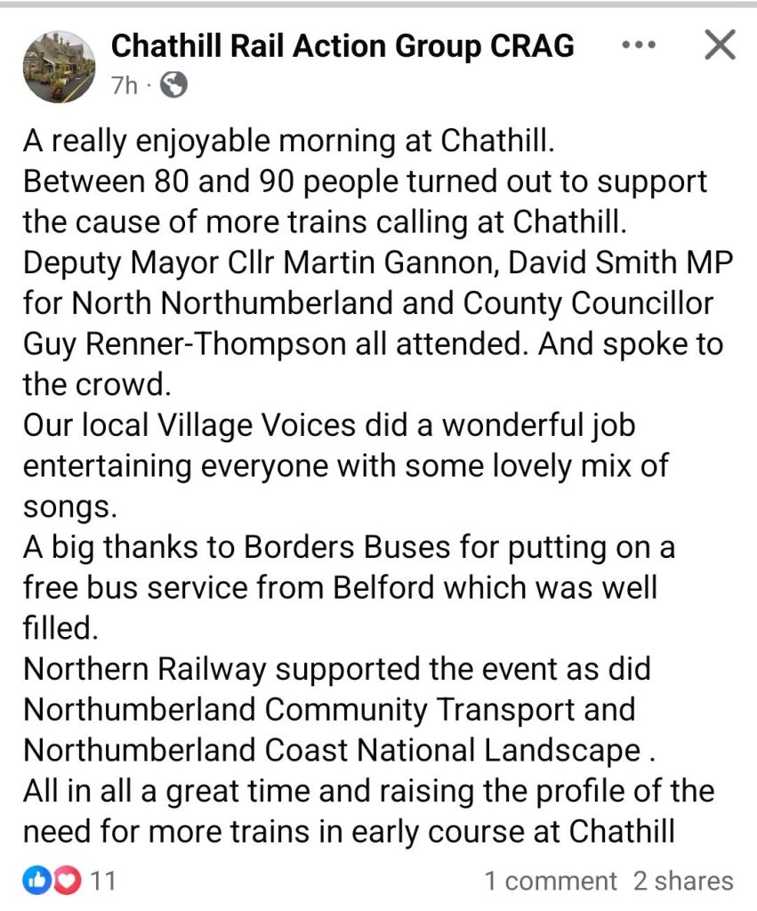 As can be seen from the above Facebook post by CRAG, this meeting was supported by a further 80-90 persons, interested in the campaign to have more trains calling at this station on the busy East Coast Main Line (ECML); which sees 140 trains a day pass through it at speed, but only the twice daily ‘Chathill Flyer’ actually stops there; giving the station just two trains in each direction per day, and then only to/from Newcastle, it isn’t currently possible to head north to Berwick or any other station from Chathill directly.