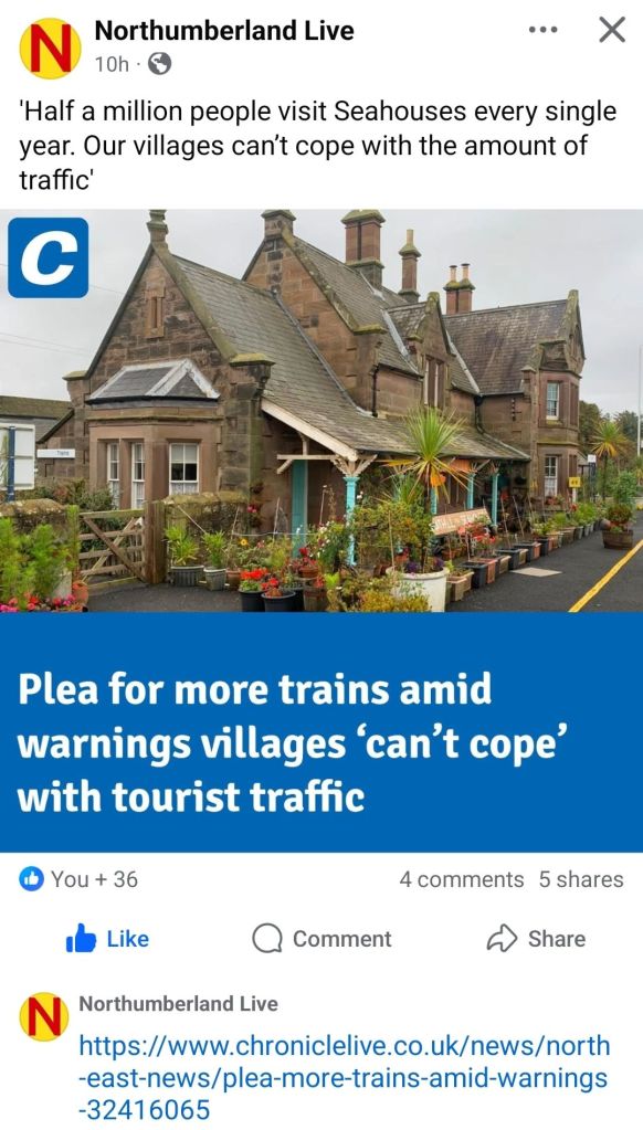 The above quote is pertinent as Northumberland faces some very stark choices with the growth of tourism, do you ‘pave over paradise’ through schemes such as dualling the A1, building ever increasing numbers of car parks to accomodate more and larger cars that put even more traffic through towns that already can’t cope, or do you invest in rail and buses and part of a co-ordinated public transport service, to ger the tourists to the attractions witbout their cars in the first place?