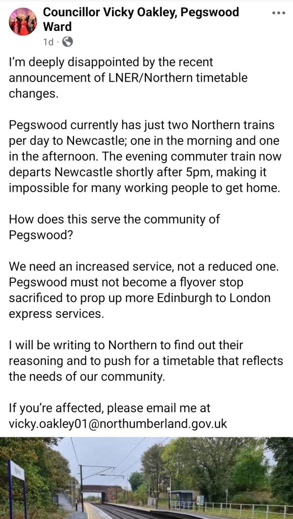 All of the stations between Newcastle and Edinburgh could do with more services; ranging from the ‘big’ stations of Berwick, Alnmouth, and Morpeth, down to the smaller ones of Chathill, Acklington, Widdrington, and Pegswood, the latter one also being highlighted by local County County Councillor Vicky Oakley in a recent Facebook post (see below).