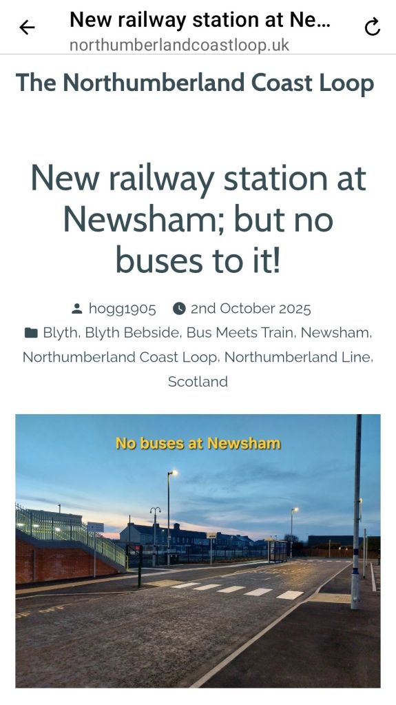 It has been good to see the BBC News coverage recently (14.10.25) about lack of direct bus services to the new station at Newsham on the Northumberland Line, after our blog post on 2nd October titled ‘New railway station at Newsham; but no buses to it!‘.