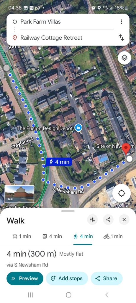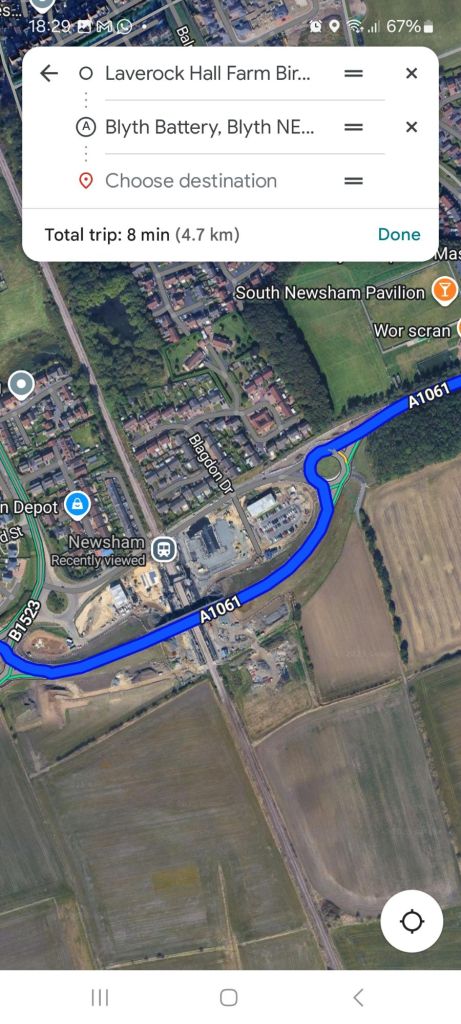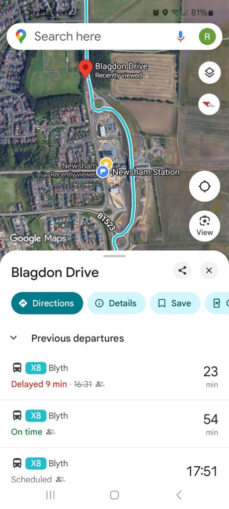 Using Google Maps, an approximate journey time can be ascertained for the walking distances to and from Newsham station to both the Blagdon Drive bus stops (for the X8 service to/from Blyth Town Centre), and the Park Farm Villas bus stops (for the X10 and X30 buses).