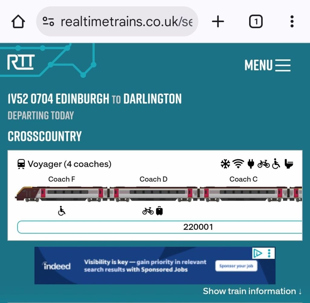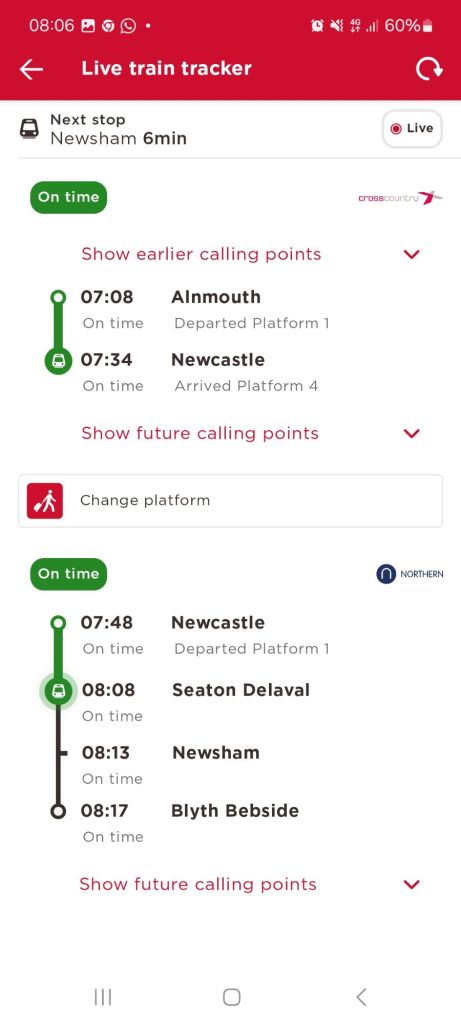 As can be seen below, arrival on the CrossCountry Voyager was on-time into Newcastle, allowing a full 14 minutes to change train, with some of this time used to nip into Sainburys at the station.