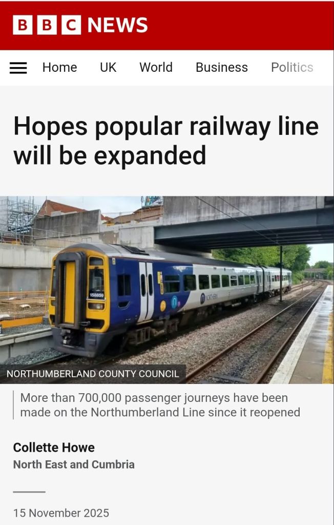 This time in two weeks, Monday 15th December 2025 will mark the first full year since the long awaited opening of the Northumberland Line to passengers. Starting with just the two stations at Ashington, and Seaton Delaval at the outset on 15th December 2024, there are now four of the six stations open, with Newsham opening in March 2025, and Blyth Bebside opening in October 2025. The next two stations at Bedlington, and Northumberland Park are due to open in ‘early 2026’, with no precise date yet announced.