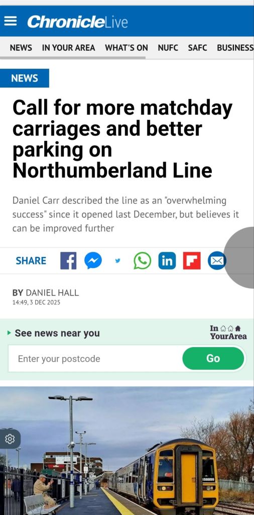 A post today in The Chronicle ‘Call for more matchday carriages and better parking on Northumberland Line‘ quoting Cllr Daniel Carr of Newsham rightly points to the need for more capacity on this thriving new line as it is approaching its first anniversary on the 15th December 2025.