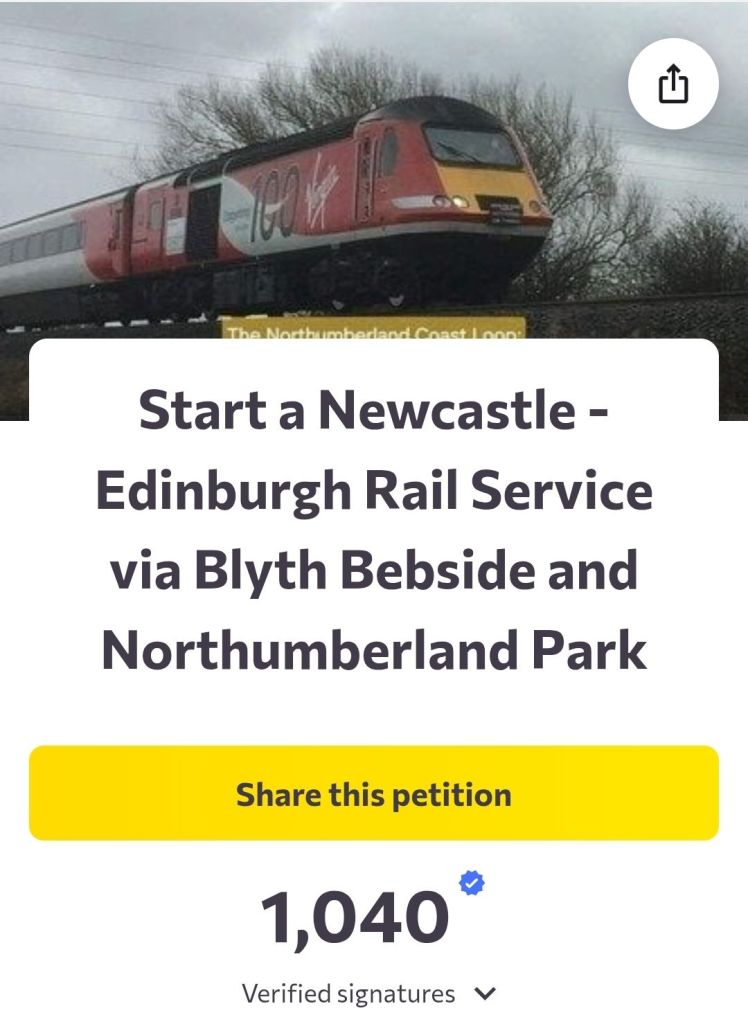 If you would like to support the petition, please do so here: https://www.change.org/p/start-a-newcastle-edinburgh-rail-service-via-blyth-bebside-and-northumberland-park/exp/cl_/cl_sharecopy_490421148_en-GB/4/679068674?recruiter=679068674&recruited_by_id=f8c66ca0-ee1b-11e6-b726-5dfd818fd527&utm_source=share_petition&utm_campaign=share_petition&utm_medium=copylink&utm_content=cl_sharecopy_490421148_en-GB%3A4