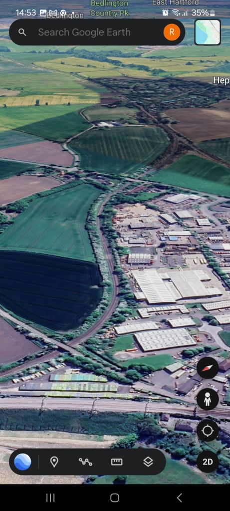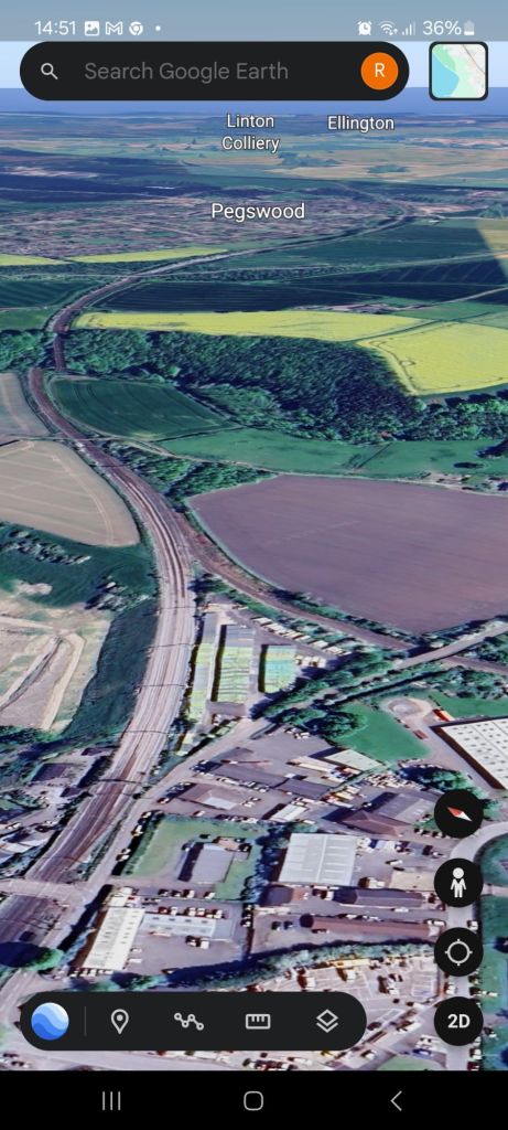 This latter link is what enables the Northumberland Coast Loop, so a train from Newcastle to Edinburgh could run up the Northumberland Line route as far as Bedlington, before turning west and running along the route parallel to Barrington Road, over the level crossing at the former White Swan pub at Choppington on the A1068 and heading to Hepscott, the line splits in two at Hepscott Junction (shown below), where the left hand line heads to Morpeth Station, whilst the right hand line is the Morpeth North Curve towards Pegswood.