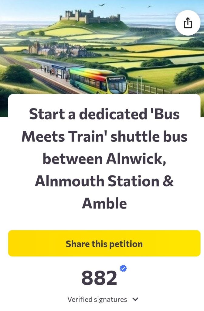 A second campaign for better, dedicated bus connections from Alnwick and Amble to Alnmouth station is also performing strongly, with 882 signatures gained so far, but as ever, more signatures are always welcomed!