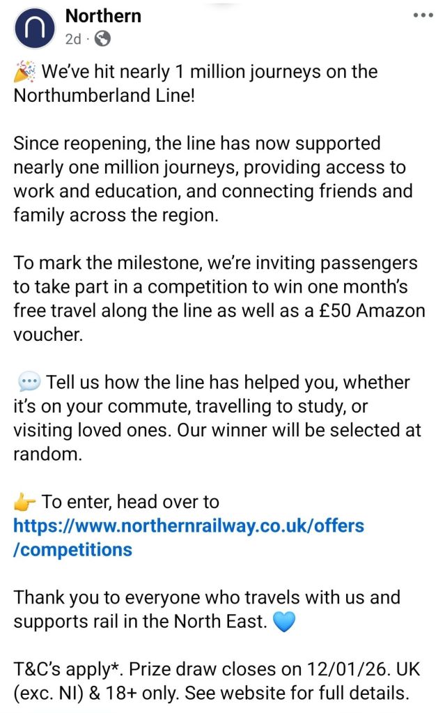 A recent post from Northern, the DfT operator who runs trains on the Northumberland Line, has announced a competition (https://www.northernrailway.co.uk/offers/competitions) for those using the Northumberland Line to enter, presumably ahead of the millionth passenger travelling on the route.