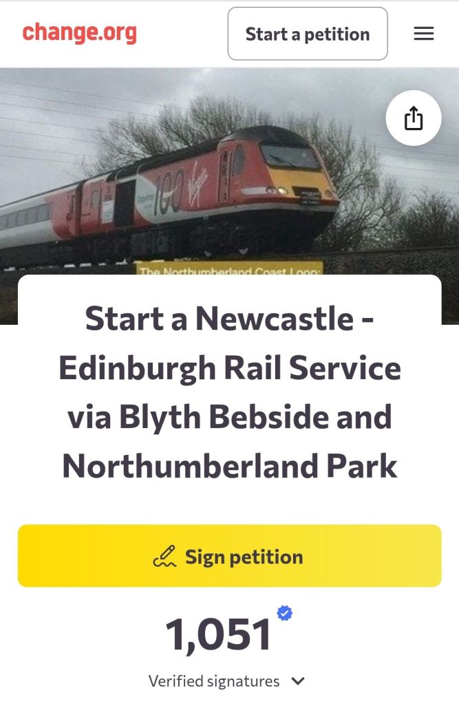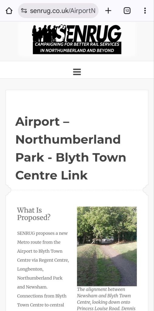 The main campaign calling for this is the SENRUG ‘Airport to Blyth Town Centre’, which would aim to rebuild the Blyth Branch into central Blyth, and then use Class 555 Metro vehicles from Newcastle Airport to Blyth Town Centre, presumably under battery power between Northumberland Park and Blyth.