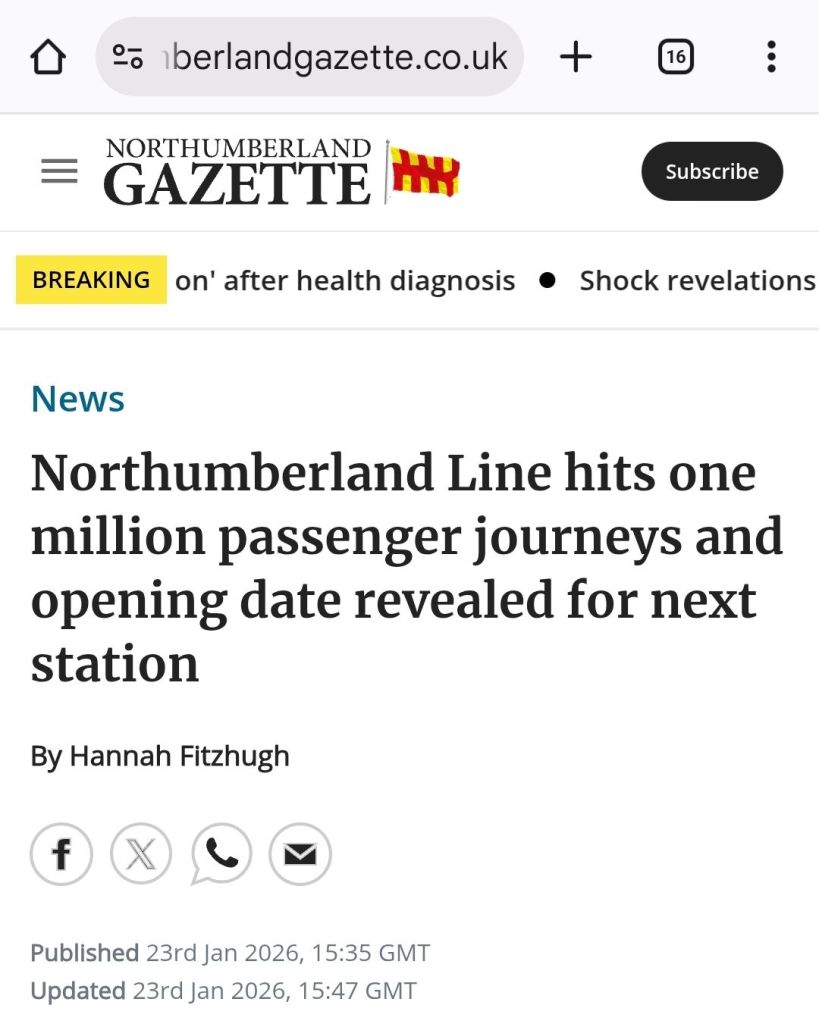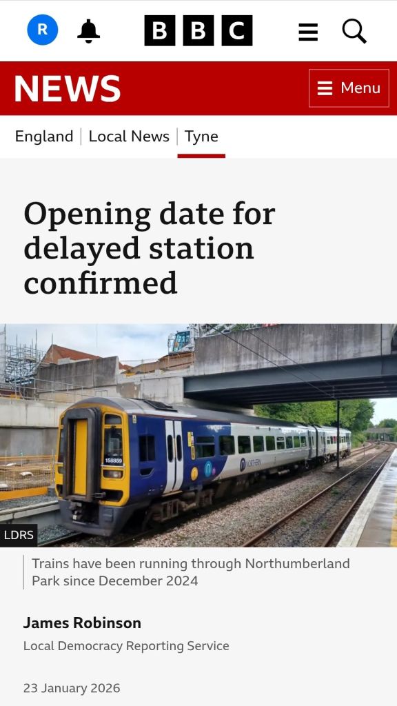 On Friday 23rd January 2026, an event was held at Blyth Bebside station to mark the millionth passenger journey on the Northumberland Line since opening just 405 days before on Sunday 15th December 2024, as shown in this article from the Northumberland Gazette.