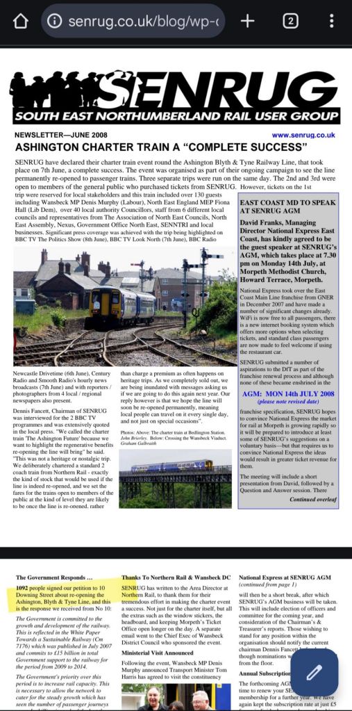 This compares well with the 2008 SENRUG petition to 10 Downing Street to reopen the Ashington, Blyth, and Tyne Line (the scheme later rebranded as the ‘Northumberland Line’, which had 1092 signatures according to their June 2008 newsletter, a line that has now carried over a million rail passengers since it opened in mid December 2024.