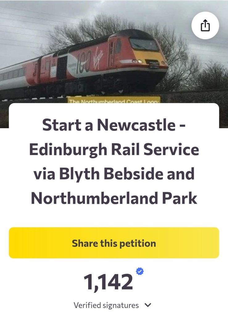 As of 21.3.26, the petition for the route (Start a Newcastle – Edinburgh Rail Service via Blyth Bebside and Northumberland Park on Change.org) now stands at an amazing 1,142 signatures, and steadily continues to grow. Please click the link above if you haven’t already done so.