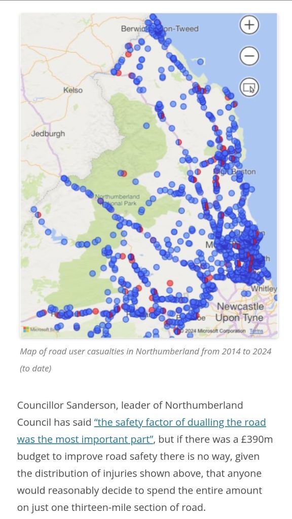 Spending £500m+ on one thirteen-mile stretch of road could surely be better allocated to reducing road casualties across Northumberland as a whole. Accident rates on dual and single carriageway sections were so similar as to not represent any real difference; so in safety terms, the argument for dualling is a false one.