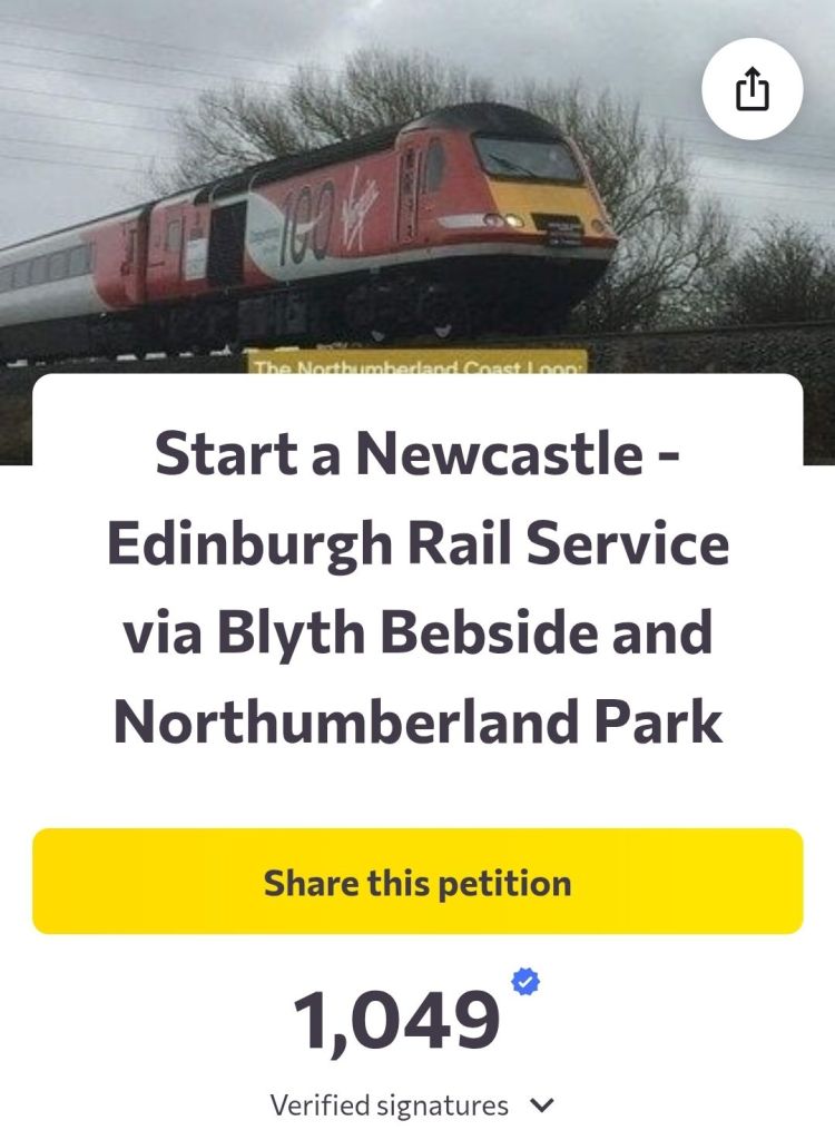 As can be seen below, this is a route that can be implemented very quickly with the political will to do so, with my own trip almost a year ago on board ‘The Seven Counties Rambler’ attesting to this, where the final leg of this long-distance circular tour going from Newcastle to Edinburgh via Bedlington on 8th March 2025.