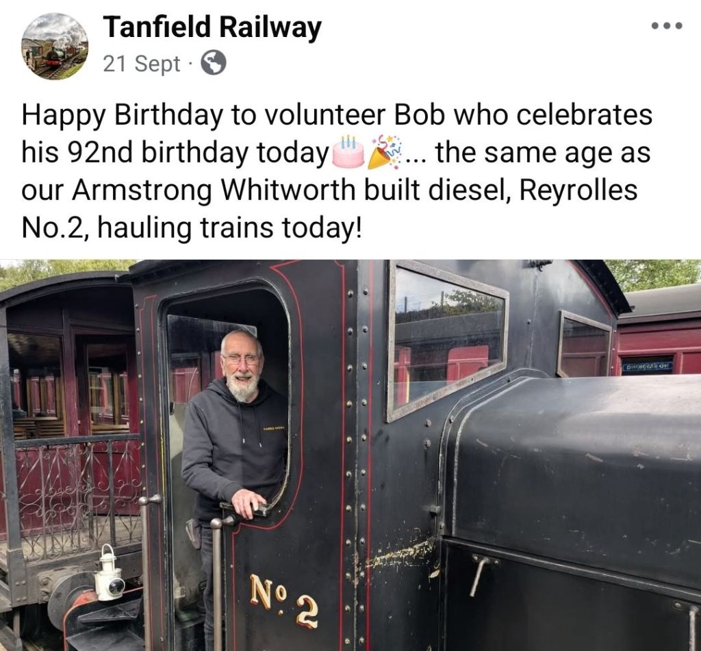 Photo of D22 active at the Tanfield RailwayPhoto of Reyrolles No.2 on the Tanfield Railway and long-time volunteer Bob, who is the same age as the loco!
