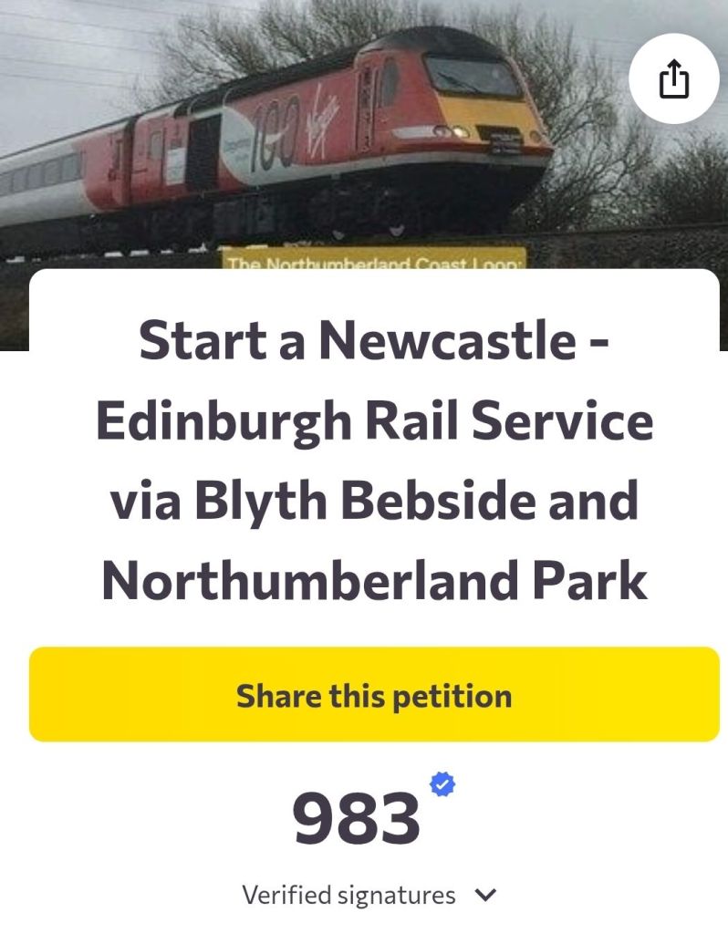 Our Change.org petition for the Newcastle to Edinburgh rail service via Northumberland Coast Loop (calling at Blyth Bebside and Northumberland Park) is steadily building again; with only 17 signatures left to go now until we reach the next target of 1000.